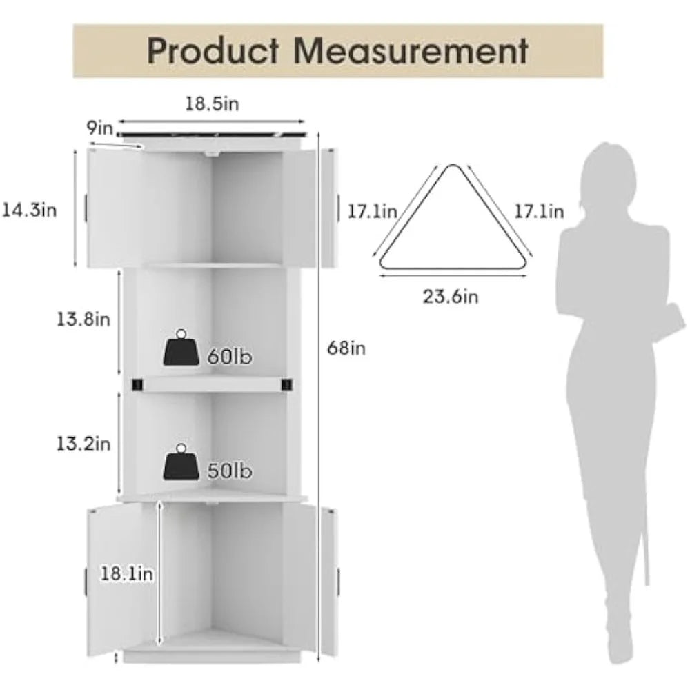 This corner cabinet measures 12.3" D x 23.6" W x 68" H, making it ideal for narrow corners where traditional furniture won’t fit. Its slim footprint and tall profile create abundant storage without sacrificing floor space.