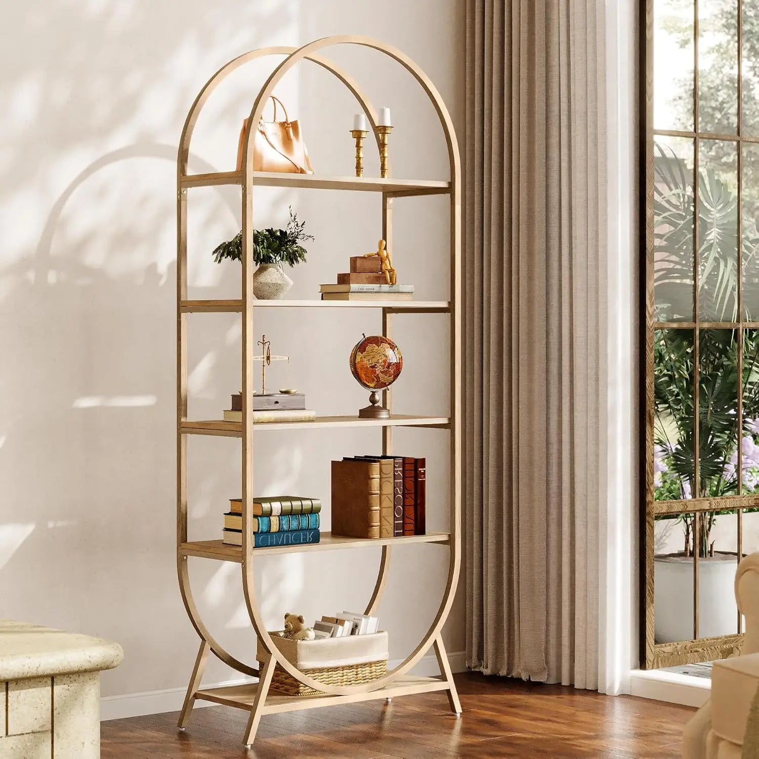Elevate your décor with the Bookshelf 5 Tier Arched Bookcase — a sleek, 70.8-inch tall freestanding display rack that blends modern design with everyday practicality. The sweeping arched frame and open-shelf silhouette create an airy, gallery-like presence that highlights books, plants, photos, and collectibles without overwhelming your space.
