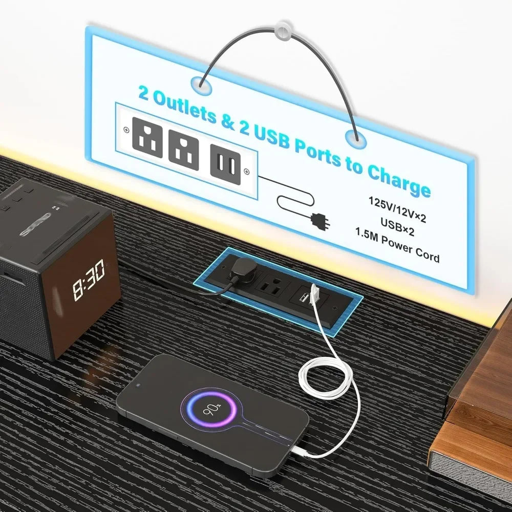 - Integrated power management: Built-in power outlets keep your TV, soundbar, streaming devices and chargers organized and within reach—no more tangled cords.