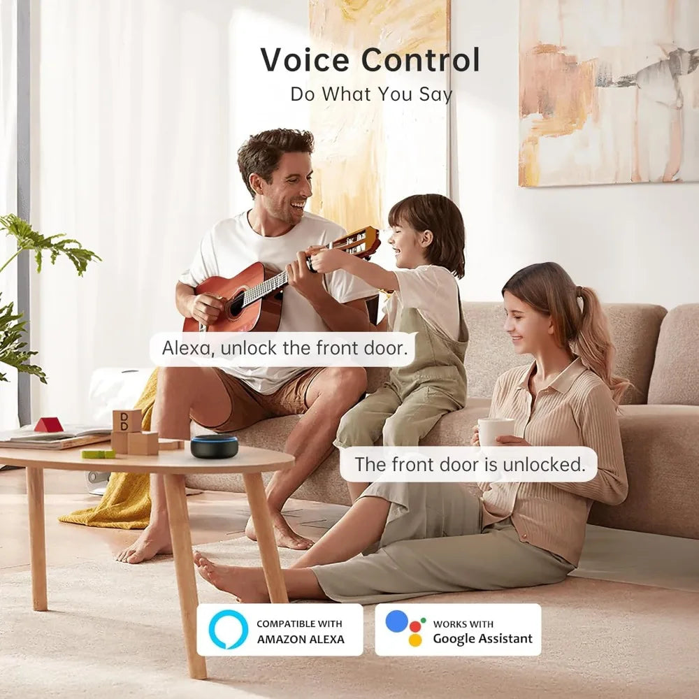 - Unlock in seven ways—APP, keypad, fingerprint, iWatch, voice control, IC fob, and mechanical keys—plus remote control via a Smonet wifi gateway.