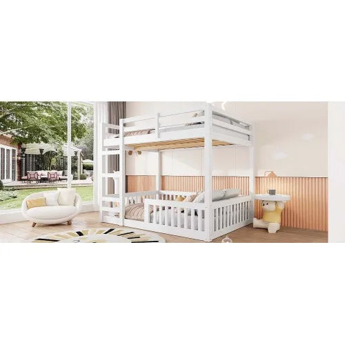 Solid wood bunk bed, minimalist design, with ladder and guardrail, white