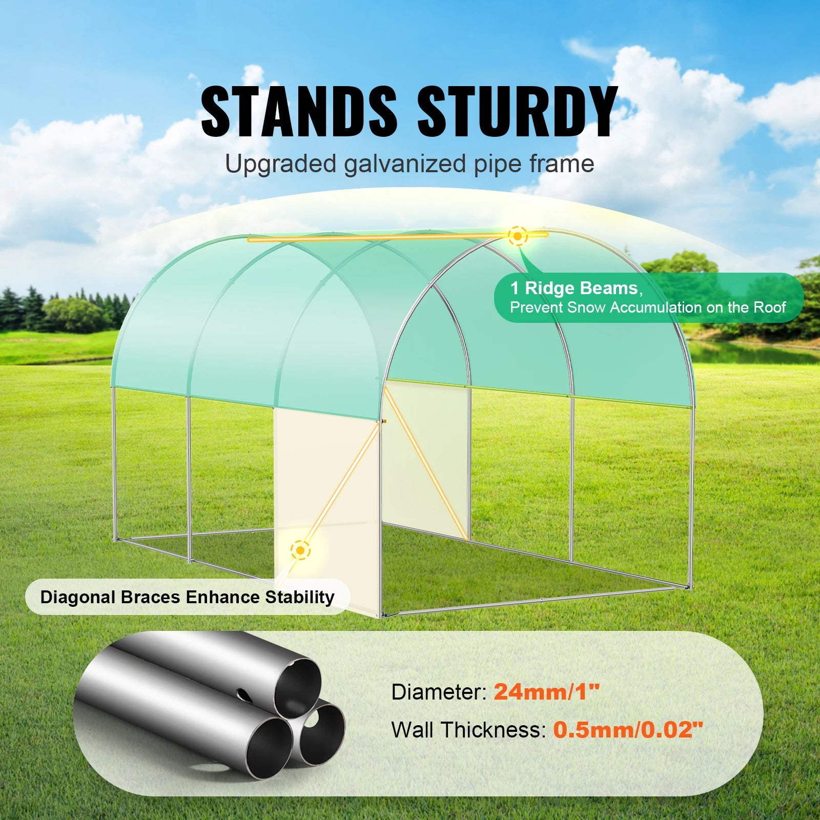 - Sturdy, heavy-duty galvanized frame with 1" diameter posts and 0.02" wall thickness, plus reinforced joints to resist wind, snow, and rain.